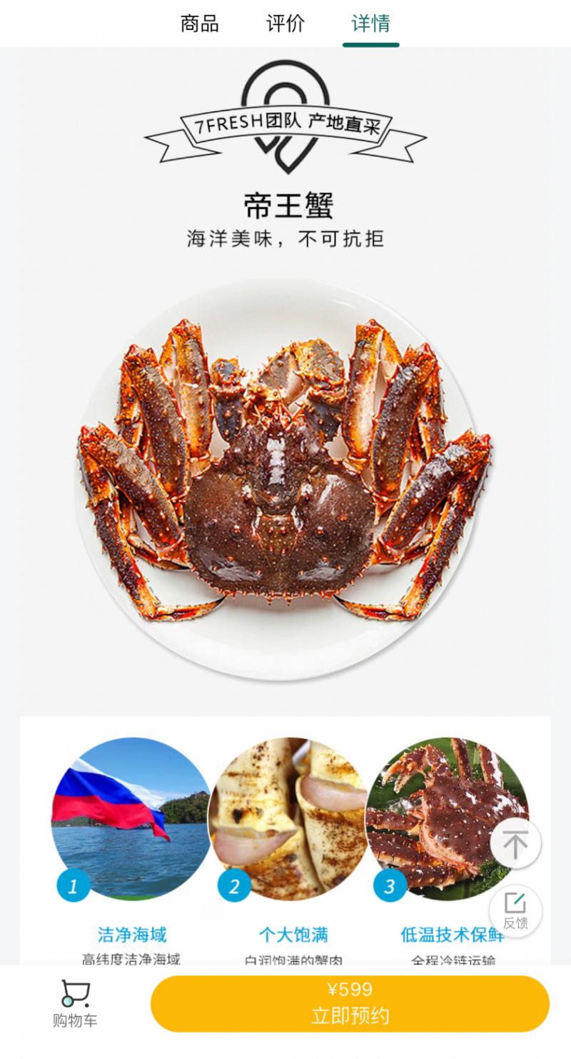 在11·11期间,京东7-FRESH的鲜活帝王蟹也打出了行业低位,10月31日起华北、华东区域7-FRESH以每只599元的价格进行预售,比各大电商平台售价便宜近25%,迅速引起消费者广泛关注。